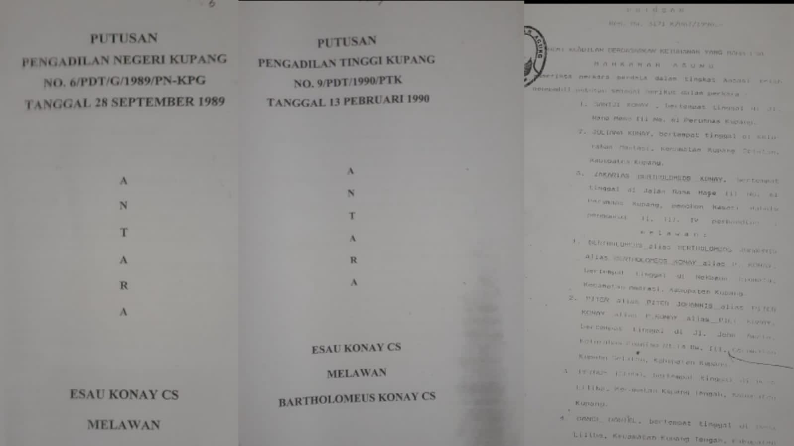 Permohonan banding yang diajukan Esau Konay Cs melawan Bertolomeo Konay Cs di Pengadilan Tinggi Kupang tahun 1990 yang teregistrasi perkara dengan nomor : 9/PDT/1990/PTK